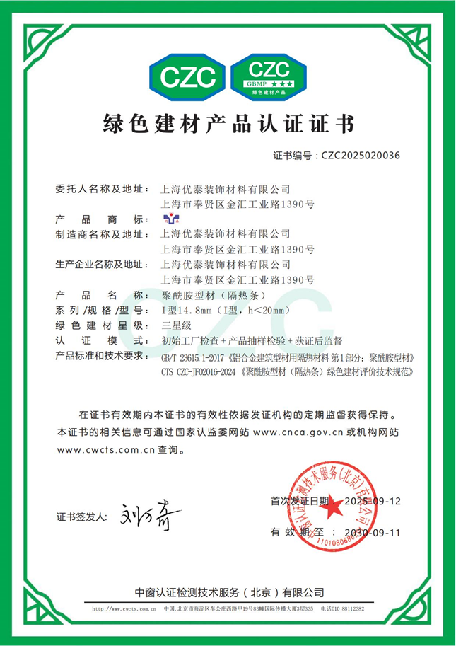 “优”品质,“泰”节能——作为隔热条行业的头部企业,经过二十余年的开拓与发展,市场占有率及业界口碑都名列前茅。公司重视产品创新与技术研发,倾力为客户打造完善的系统解决方案。在节能减排、绿色环保方面,优泰更是通过技术迭代、设备焕新、品质升级等积极布局,取得了良好成效。此次,绿色建材产品双三星级认证证书的取得,对于优泰是技术的肯定、体系的肯定,也是理念的肯定,战略的肯定,标志着优泰在绿色高质量发展道路上迈出坚定夯实的一大步,也是破局当下、着眼未来、肩负责任,坚定长期主义的一大步。