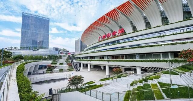 广州白云站综合交通枢纽由始建于1916年的棠溪站升级扩建而成,采用“云山珠水、盛世花开”的设计理念,站房外形像一朵盛开的木棉花。