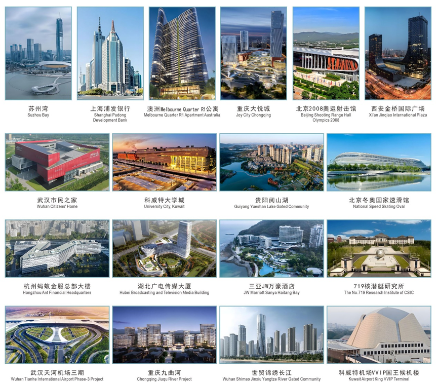 【经典案例】:上海浦东发展银行、北京2008奥运射击馆、西安金桥国际广场、重庆大悦城、武汉市民之家、贵阳阅山湖、北京冬奥国家速滑馆、杭州蚂蚁金服总部大楼、湖北广电传媒大厦、三亚JW万豪酒店、719核潜艇研究所、武汉天河机场三期、重庆九曲河、世贸锦绣长江、科威特大学城、 科威特机场VVIP国王候机楼、澳洲 Me I bourne Quarter R1公寓等。