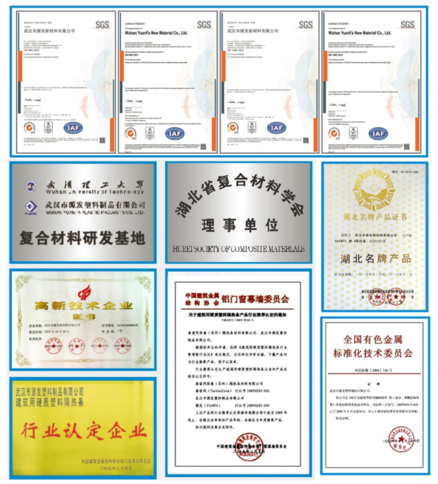 【主要荣誉】:国家高新技术企业、国家火炬计划项目、湖北名牌、首批通过国家生产认定的隔热条企业、隔热条国家标准的编制单位(GB/T 23615.1-2009、GB/T 23615.1-2017)、 隔热条建筑行业标准 (JG/T174-2005、JG/T174-2014)编制单位、首批及连续17年获得铝门窗幕墙行业隔热条推荐品牌称号等。