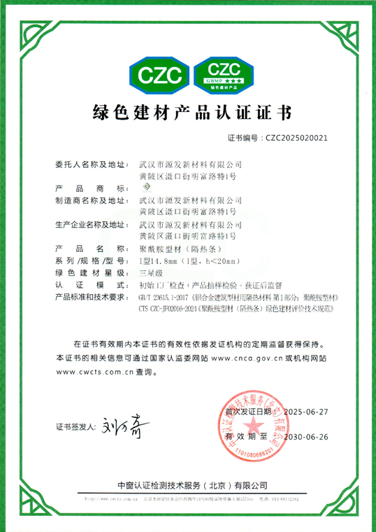 在审厂期间,源发的标准化、系统化、绿色化运营模式给审厂专家一行留下深刻印象。在全行业响应“双碳”发展战略目标的当下,源发通过积极布局、有效实施,整个企业呈现出高效高能的发展态势,企业在行业竞争剧烈的大环境下,展示出强大的发展力与品牌力。在认证进入交流评审阶段,通过企业问答、资料审核等,源发各项指标均达到行业领先水平,经评审专家一致通过,武汉源发获得聚酰胺型材(隔热条)绿色建材产品(三星级)认证证书。